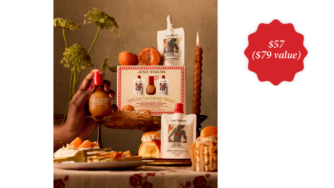 This sumptuous Josie Maran body-care collection includes travel-sized Whipped Argan Oil Body Butter in Topless Tangerine, Sugar and Argan Oil Body Scrub in Topless Tangerine and the Fine Fragrance Mist in Topless Tangerine.