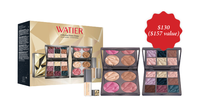Perfect for those who want to create a glamorous look all year round, the Watier Prisma Donna collection set features a nine-color eyeshadow palette, an essential face palette complemented by a lip gloss in the Lumière stellaire hue.