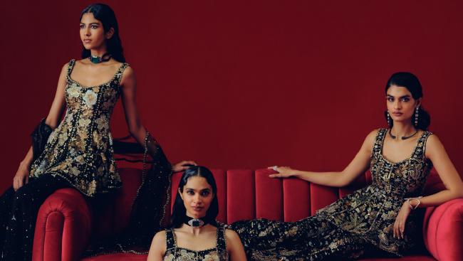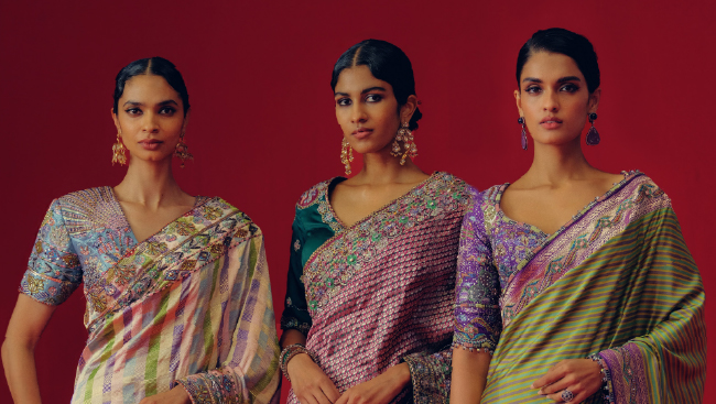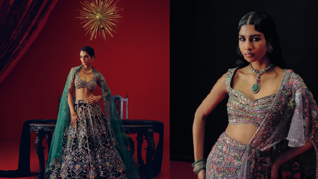 Aisha Rao’s quintessential appliqué technique once again takes center stage in this edit, creating surreal, sculptural, and richly textured silhouettes. Crafted from raw silks, organzas, dupions, and Banarasi tissues, the garments effortlessly strike a balance between structure and ease. Draped saris, sculpted lehengas, sharply tailored bandhgalas, fluid kaftans, corseted gowns, shararas, and statement gowns all find space in the Wild at Heart 2.0 edit.