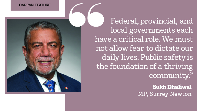 MP Sukh Dhaliwal of Surrey Newton calls for a collaboration between law enforcement agencies at all levels: "No one should have to live or work in fear. Federal, provincial, and local governments each have a critical role. We must not allow fear to dictate our daily lives.