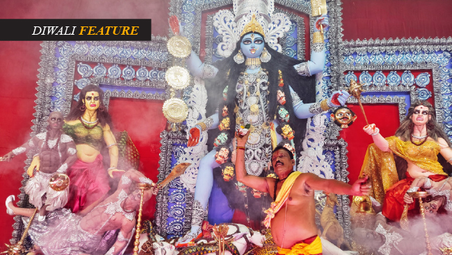 In West Bengal, Assam, and Odisha, the festival of Kali Pujo, dedicated to the goddess Kali, a fierce form of Adi Parashakti, coincides with Diwali. Unlike the North Indian focus on Lord Rama, Bengalis worship Kali as the destroyer of evil and protector of the good. Hindu Puranas state that when demons threatened the balance of the world, Kali emerged in a terrifying form to annihilate them. On Kali Pujo, households and community pandals build altars adorned with red hibiscus flowers and food offerings. The rituals often include animal sacrifices, reflecting Hinduism's tantric traditions, and Sanskrit mantras. Recitation of the popular 'Shyam Sangeet' dedicated to the Goddess Kali is also observed across the region.