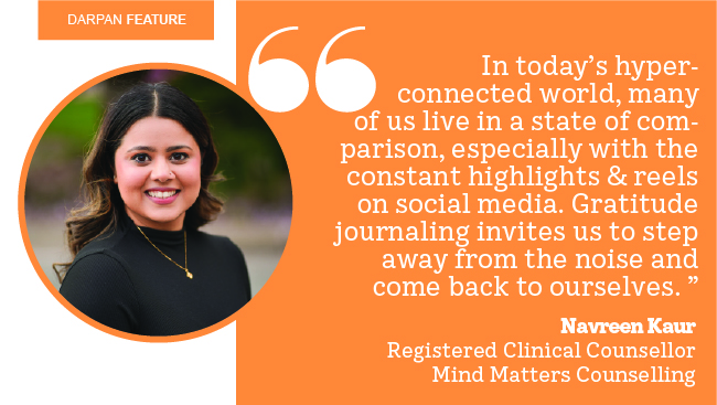 Similarly, Pavneet Sandhu Gill, registered clinical counsellor and owner at Luxia Counselling, describes gratitude journaling as a simple yet transformative practice. “It helps shift your focus from stress to appreciation,” she says. “Life moves quickly, and constant demands can leave us feeling stressed and distracted. Taking a few minutes to note what we’re grateful for helps us slow down and focus on the moments that matter most.”