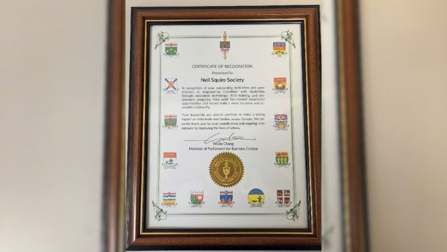 During the visit, MP Chang presented a certificate to the Neil Squire Society in recognition of their dedication and commitment to empowering Canadians with disabilities through innovative technology, skills training, and employment programs.