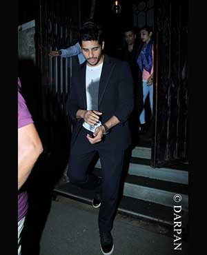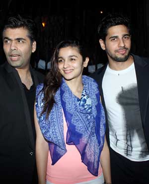 Glowing in the glory of hits Alia Bhatt, Sidharth Malhotra and Karan Johar posed happily for the cameras outside Cafe Nido