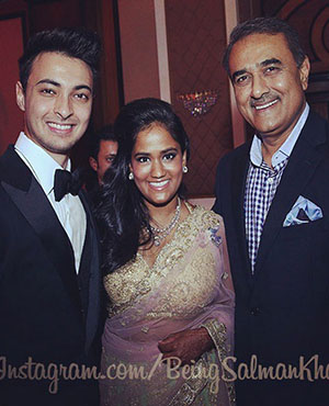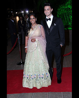 Arpita donned a cream lehenga with light embroidery while Ayush wore a black suit for their reception and the entire family stepped out to pose for the media before the event.