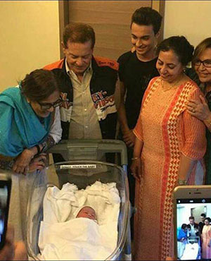 One can expect big brother Salman Khan to throw a grand bash once baby and mother are back home. Seen here Salim Khan, Salma Khan, Helen, Aayush and his mother look at the baby boy.