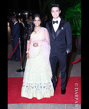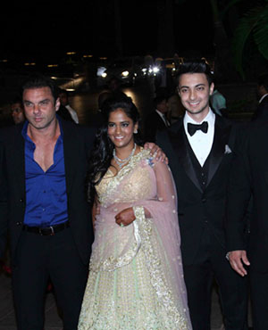 Arpita donned a cream lehenga with light embroidery while Ayush wore a black suit for their reception and the entire family stepped out to pose for the media before the event.