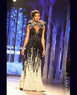 Mr Bachchan's daughter wore a white embellished dress with a feather cape. Sandeep Khosla presents his showstopper.