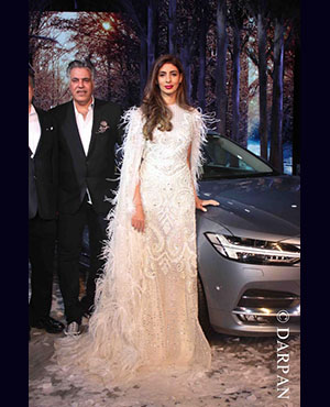 Mr Bachchan's daughter wore a white embellished dress with a feather cape. Sandeep Khosla presents his showstopper.