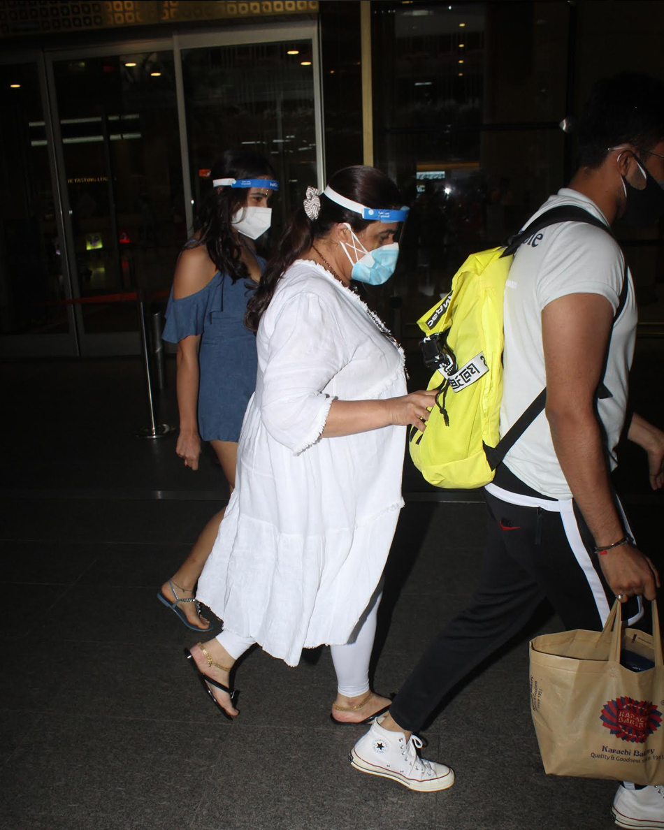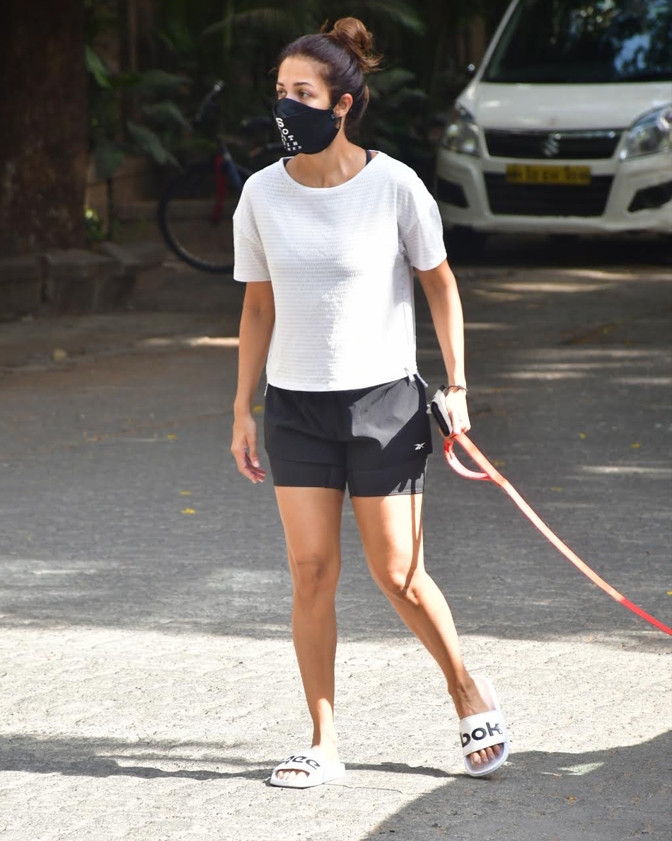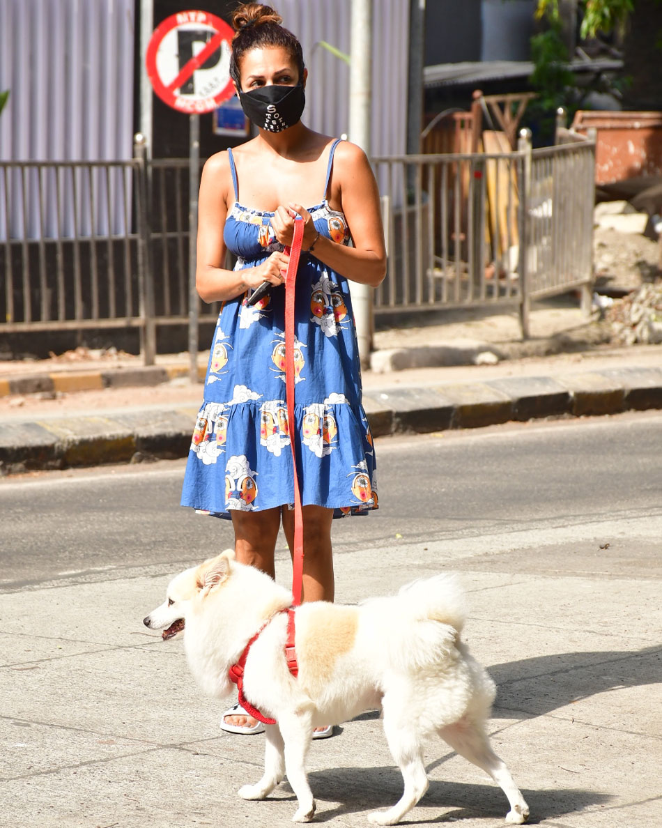 Malaika Arora in blue dress and in shorts takes the dog for a walk in the summer. Sara Ali Khan, brother Ibrahim, and mom Amrita Singh all spotted at the airport looking casual.