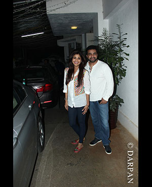 Shilpa Shetty with husband Raj Kundra caught at the screening of Punjabi film 'Chaar Sahibzaade' in Mumbai, Wednesday. Besides them, producer Ramesh Taurani, singers Palak Muchhal, Gurdas Maan and Sukhwinder Singh also attended the screening.