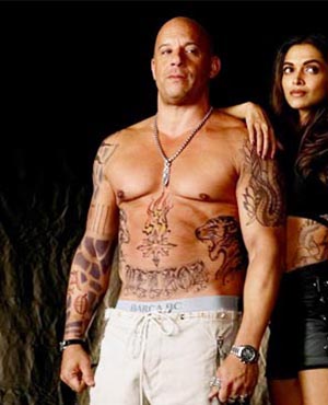 The hunky actor is seen shirtless, showing off his tattoo-covered abs in the Facebook image, while Deepika is wearing a bold black leather outfit which not just shows her washboard abs but also some temporary tattoos for a power-packed look.
