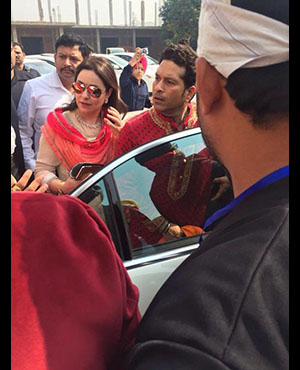 Batting legend Sachin Tendulkar and his wife Anjali and founder and chairperson of the Reliance Foundation Nita Ambani, who is also the owner of Indian Premier League (IPL) Twenty20 team Mumbai Indians, for whom off-spinner Harbhajan plays, were among the dignitaries at the wedding.