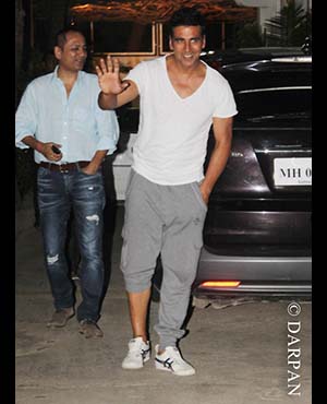 Akshay Kumar along with wife Twinkle Khanna and son Aarav was spotted at the special screening of Holiday at Sunny super sound