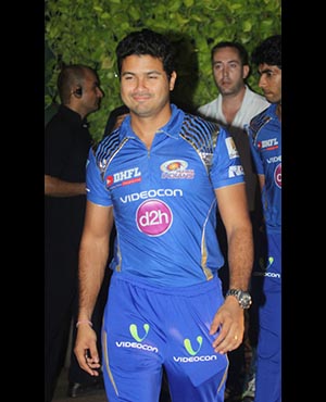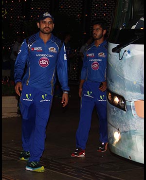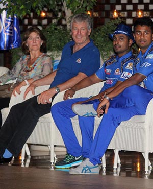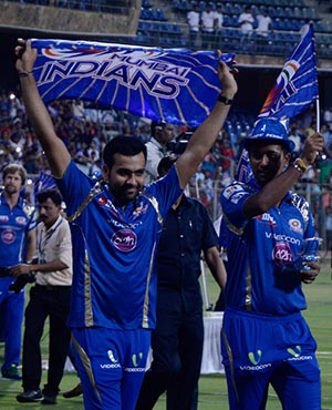 Overjoyed members of the team -- Harbhajan Singh, Lasith Malinga, Parthiv Patel, Kieron Pollard, Ambati Rayadu -- unable to contain their jubilation, posed with the trophy.