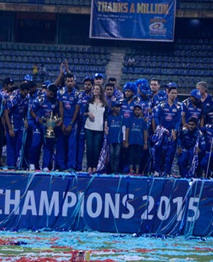 The team, led by captain Rohit Sharma and owner Neeta Ambani, along with its icon, Sachin Tendulkar, and members of the support staff -- comprising Ricky Ponting, John Wright, Jonty Rhodes, Anil Kumble, Robin Singh and Shane Bond -- did a victory lap as fans in the crowd waved the team flag.