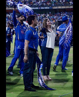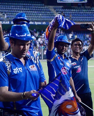 The team, led by captain Rohit Sharma and owner Neeta Ambani, along with its icon, Sachin Tendulkar, and members of the support staff -- comprising Ricky Ponting, John Wright, Jonty Rhodes, Anil Kumble, Robin Singh and Shane Bond -- did a victory lap as fans in the crowd waved the team flag.