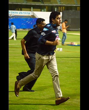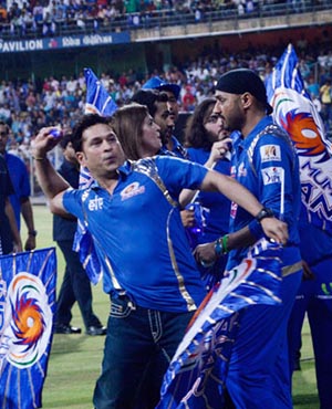 Overjoyed members of the team -- Harbhajan Singh, Lasith Malinga, Parthiv Patel, Kieron Pollard, Ambati Rayadu -- unable to contain their jubilation, posed with the trophy.