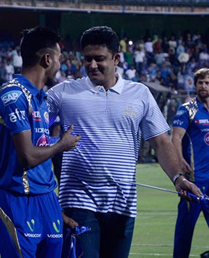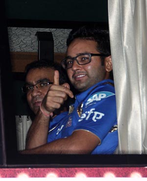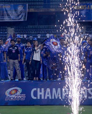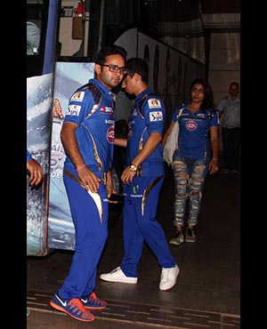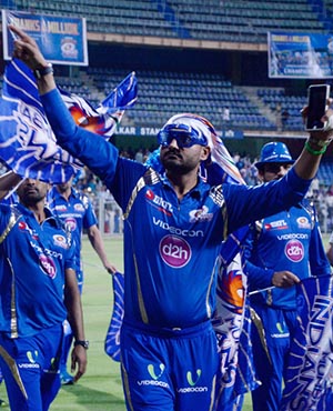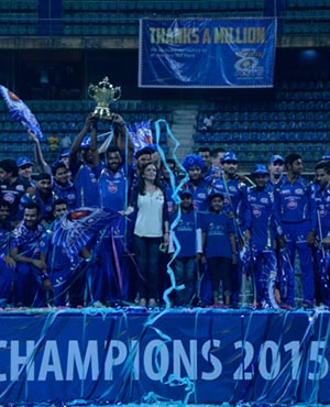 Overjoyed members of the team -- Harbhajan Singh, Lasith Malinga, Parthiv Patel, Kieron Pollard, Ambati Rayadu -- unable to contain their jubilation, posed with the trophy.