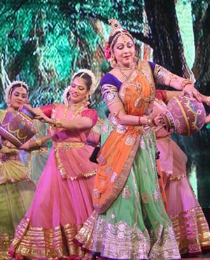 Bollywood actor Hema Malini gestures during the launch of International Society for Krishna Consciousness & 50th Anniversary film Joy of Devotion, in Mumbai