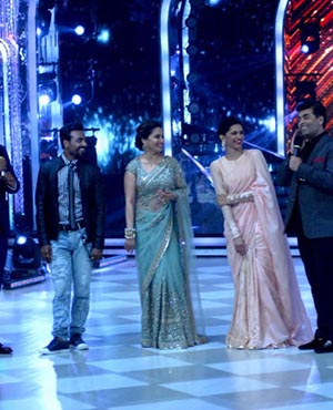 Both the stars were seen dancing with the contestants while shooting for the semi-final episode of the dance reality show. Dancing diva Madhuri Dixit, Karan Johar and choreographer Remo D’Souza also shook their legs with them.