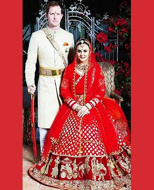 Rich red in colour, the lehenga had a baraat procession embroidered in gold thread as the border. Meanwhile, Gene wore a sherwani to complement his bride's traditional look. Gene's outfit, courtesy Raghavendra Rathore.