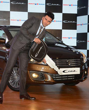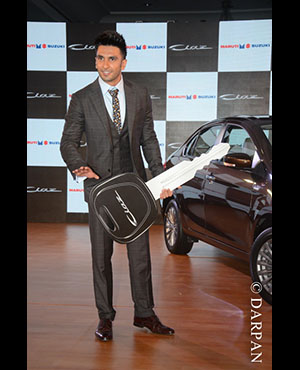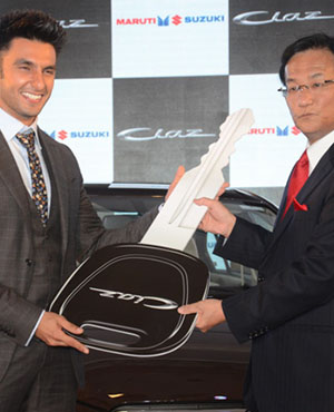 Kenichi Ayukawa, MD and CEO, Maruti Suzuki India Limited and actor Ranveer Singh during the launch of Maruti Suzuki Ciaz in Mumbai.