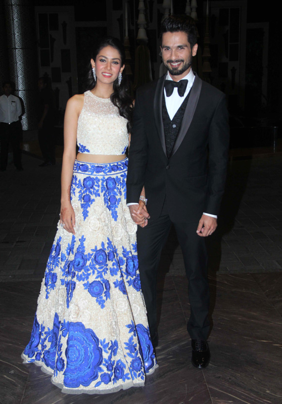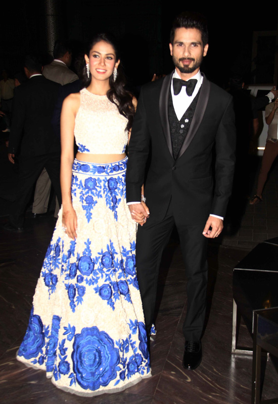 Mira looked elegant in Manish Malhotra creation, and teamed it with jewels from Nirav Modi's Luminance Collection, wearing a bracelet, cascading earrings and ring. Shahid matched up with her style in a suave tuxedo with a bow.