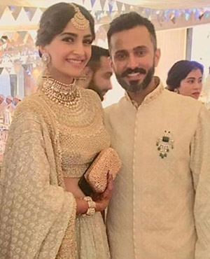 Sonam wore a traditional dress that featured a heavily-embroidered gold blouse and ivory-gold lehena. She matched the dress with traditional jewellery -- jadau neckpiece, maang-tika and jhumkas. Her hair was neatly done up in a long braid and adorned with a white garland.