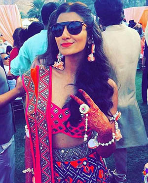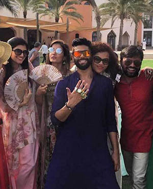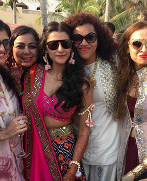 Bollywood actress Sonam Kapoor and her stylist sister Rhea were at their fashionable best as they attended designer Kunal Rawal's sister's wedding in Oman. The girls pose with the bridal couple - Sasha Rawal and Samarth Bajaj.