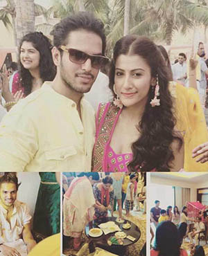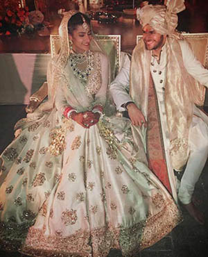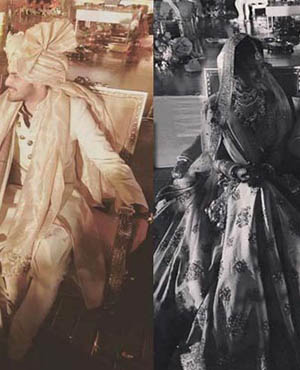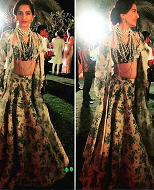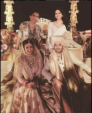 Bollywood actress Sonam Kapoor and her stylist sister Rhea were at their fashionable best as they attended designer Kunal Rawal's sister's wedding in Oman. The girls pose with the bridal couple - Sasha Rawal and Samarth Bajaj.