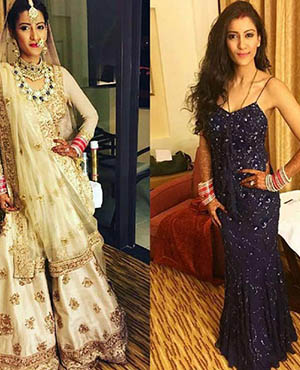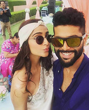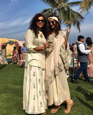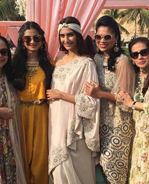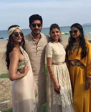 Bollywood actress Sonam Kapoor and her stylist sister Rhea were at their fashionable best as they attended designer Kunal Rawal's sister's wedding in Oman. The girls pose with the bridal couple - Sasha Rawal and Samarth Bajaj.