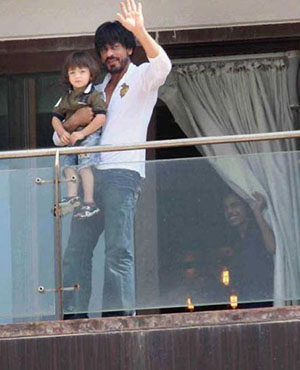 And accompanying Bollywood's Badshah was none other than li'l AbRam. SRK held AbRam in his arms as he waved waiting fans from Mannat's balcony. AbRam was vute as a button in shorts, t shirt and sandals, while dad SRK was in jeans and white T Shirt.
