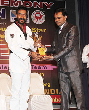 Ajay Devgan being felicitated by Taekwondo Grandmaster Hwangrom Korea in Mumbai