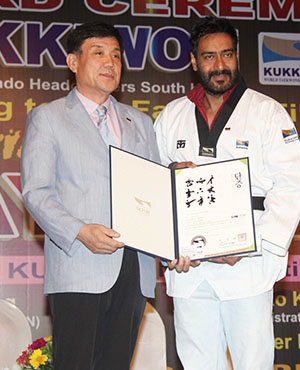 Ajay Devgan being felicitated by Taekwondo Grandmaster Hwangrom Korea in Mumbai