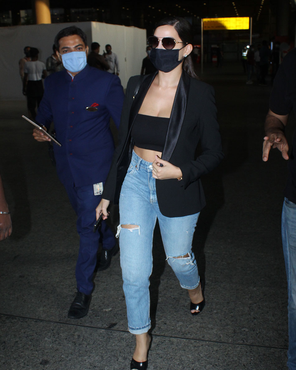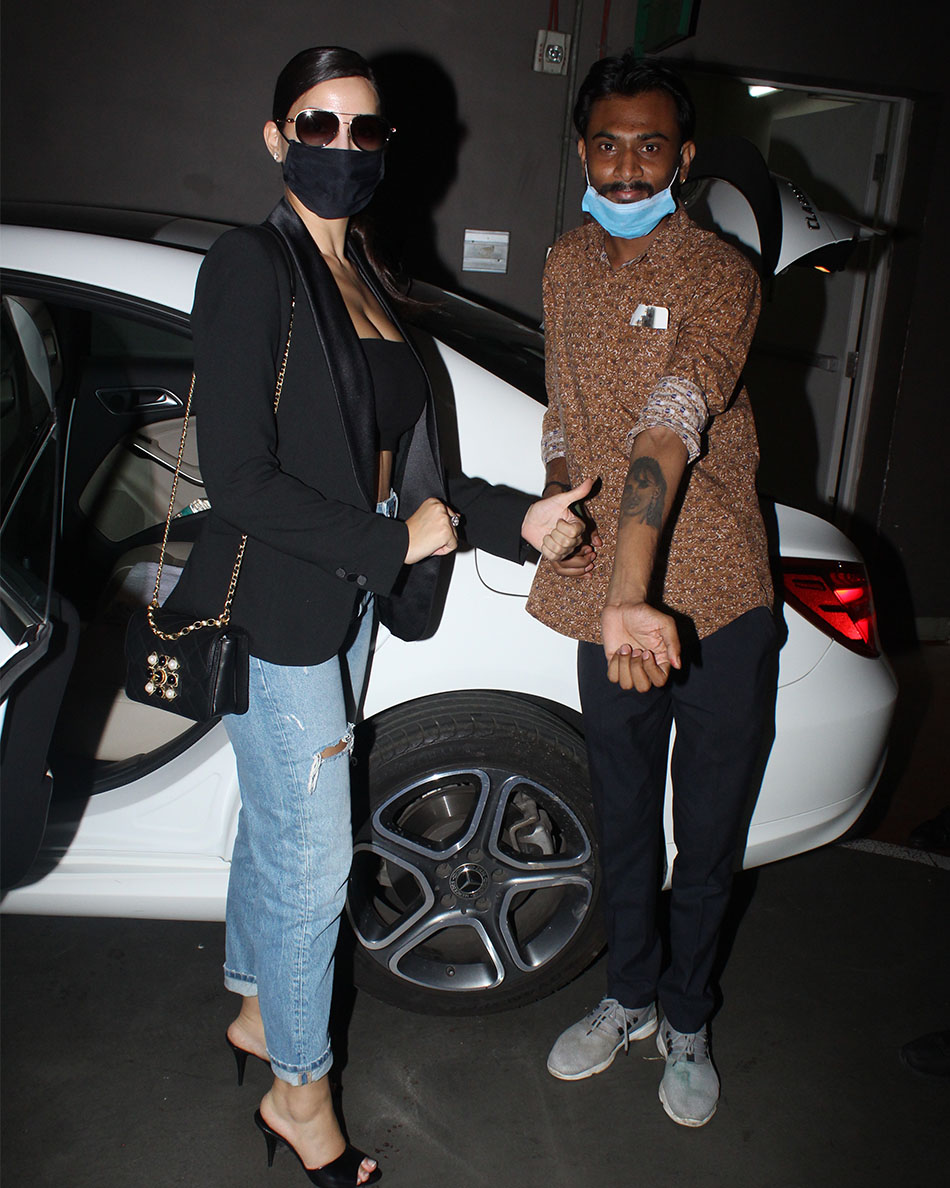 Canadian dancer and actress Nora Fatehi with security team spotted by the press looking dapper in her jeans and high heels. She takes a picture with a fan who has her face tattooed on his arm. She also cuts a cake with him.