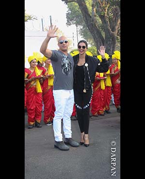 They arrived to a 'desi' fanfare of biker women dressed in red nauvaris (nine-yard saris) and yellow turbans, even as men played the Nashik 'dhol' (big drum) and trumpet-like curved folk instrument 'tutari'. Diesel looked excited as he waved out to the media and to the crowd there with much gusto.