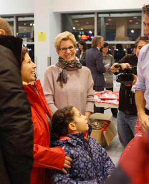 Syrian refugees are greeted by Canada's Prime Minister Justin Trudeau, Ontario Premier Kathleen Wynne, Defence Minister Harjit Sajjan on their arrival from Beirut at the Toronto Pearson International Airport in Mississauga, Ontario, Canada.