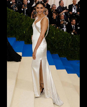 While Priyanka wore a fawn Ralph Lauren trench coat with a long train, Deepika sported a simple white satin Tommy Hilfiger gown with more attention to detail on her ornate hair accessories.