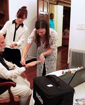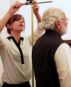 An artist takes measurements of Prime Minister Narendra Modi for his wax statue, in New Delhi on Wednesday
