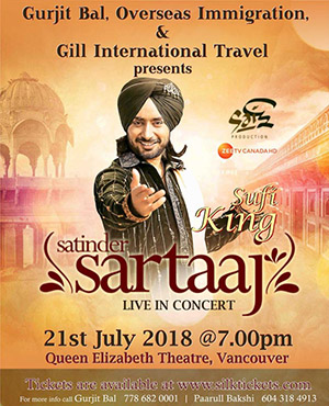 Get ready Vancouver; Gurjit Bal Productions is bringing you the world-renowned Punjabi Singer Satinder Sartaaj known for his many famous Sufi songs. The concert will take place on Saturday, July 21st at the state of the art Queen Elizabeth Theatre in the heart of Downtown Vancouver.
