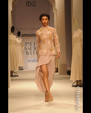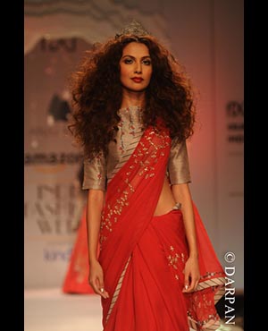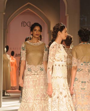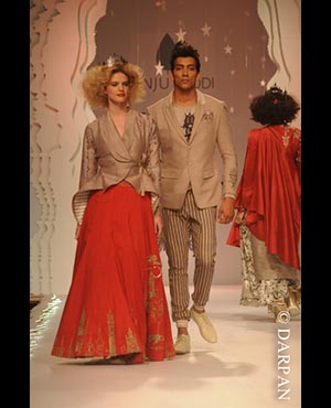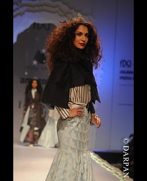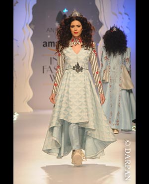 A prince, princess, magnificent castles, swans and a ship emerging out of turbulent waves - the words may seem to pop out of a fairytale, but these are some of the elements that designer Anju Modi used to showcase her collection 'How to write a fairy tale' at the Amazon India Fashion Week