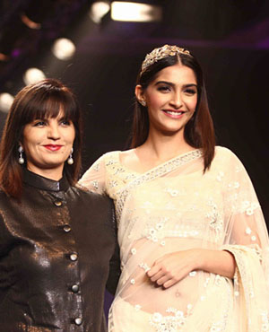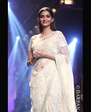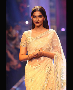 She walked the ramp for PC Jeweller. Whereas Sonam walked in a designer Neeta Lulla outfit. In a white net sari wearing a golden headband on her head with studs and a bracelet, she looked gorgeous.