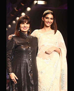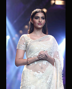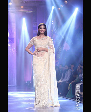 She walked the ramp for PC Jeweller. Whereas Sonam walked in a designer Neeta Lulla outfit. In a white net sari wearing a golden headband on her head with studs and a bracelet, she looked gorgeous.