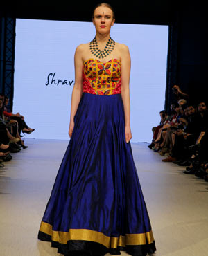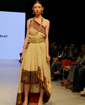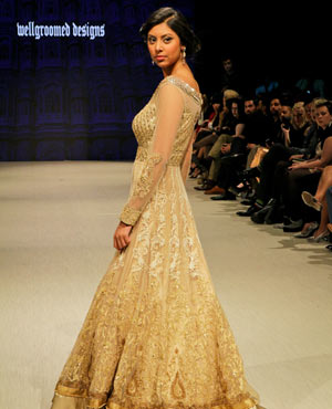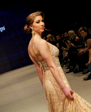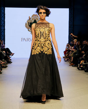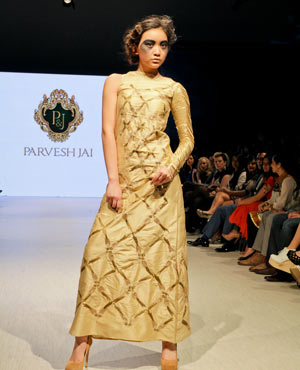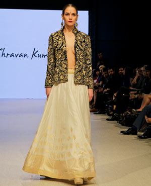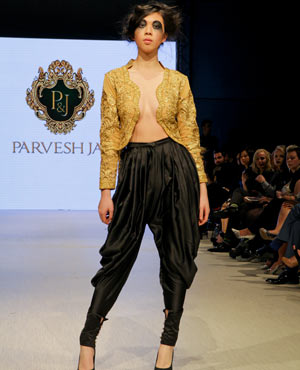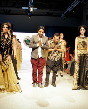 Parvesh & Jai, who are based in Delhi, try to evoke a strong female presence in their collections, and the focus for their Fall/Winter collection was ‘The Baroque Princess.” The collection was comprised of evening gowns, jump suits, bolero jackets and a-symmetrical dresses in shades of beige, black and gold showcasing the best of the Baroque art period from 1590 to 1725. These fashion forward pieces were simply stunning, and the embroidery in gold motifs exhibited attention to detail and craftsmanship at its finest!