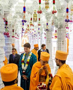 Canada's Prime Minister Justin Trudeau greets people as he visits the BAPS Shri Swaminarayan Mandir to celebrate the 10th anniversary of the Hindu temple in Mississauga, Ontario