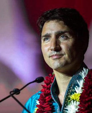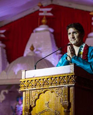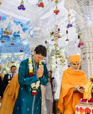 Canada's Prime Minister Justin Trudeau greets people as he visits the BAPS Shri Swaminarayan Mandir to celebrate the 10th anniversary of the Hindu temple in Mississauga, Ontario