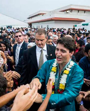 Canada's Prime Minister Justin Trudeau greets people as he visits the BAPS Shri Swaminarayan Mandir to celebrate the 10th anniversary of the Hindu temple in Mississauga, Ontario